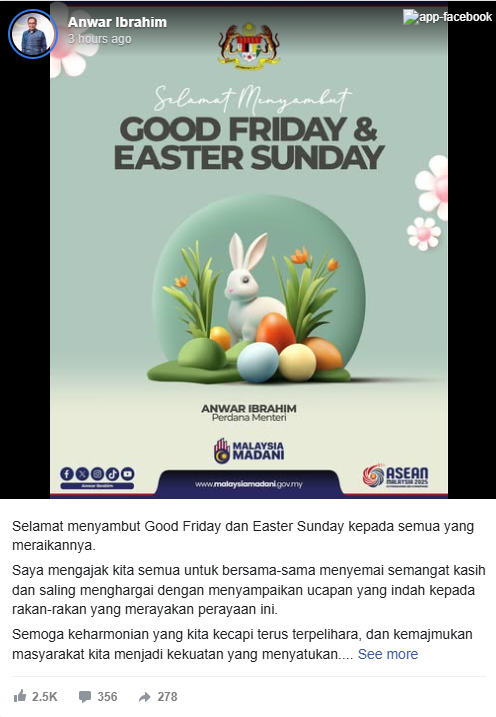 In a Facebook post, Anwar encouraged all Malaysians to nurture a spirit of love and mutual respect by extending warm wishes to friends celebrating the occasion.