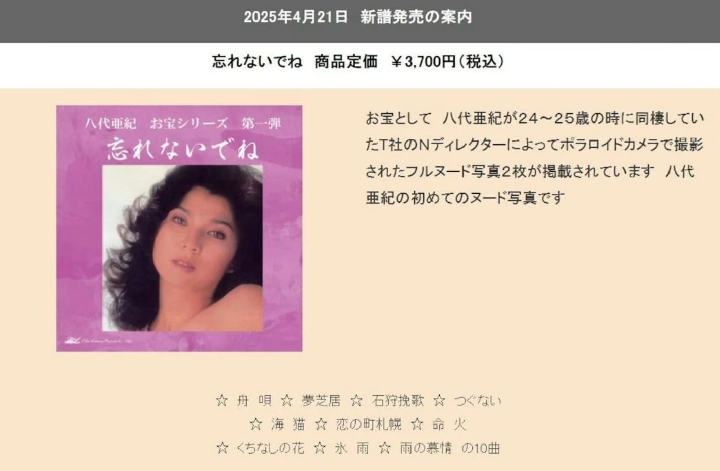 Last year, Japanese record company New Century Records reportedly made a huge profit by promoting Aki’s memorial album with a controversial gimmick. They offered two nude polaroid photos taken when she was in her 20s as a “bonus” gift. The nude photos were taken while she had been in a relationship with a record company executive back then.